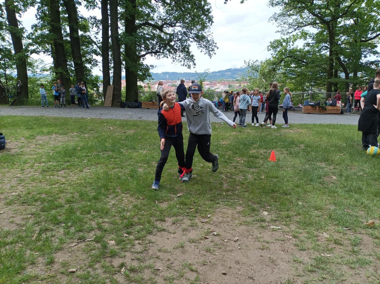 Dnešní den děti z prvního stupně trávily na Rokycanské stráni. Ta se stala místem soutěžení v disciplínách, za které by se piráti nemuseli stydět. Děti si vyzkoušely lovit mořské živočichy, skákaly v pytlích, střílely prakem, chodily po slepu i procvičily rovnováhu na rovnovážném laně. Organizátoři z řad deváťáků si pochvalovali výkony pirátů, vsichni si dopoledne moc užili. Hodnotíme tedy akci jako povedenou a budeme se těšit zase na další společné aktivity.