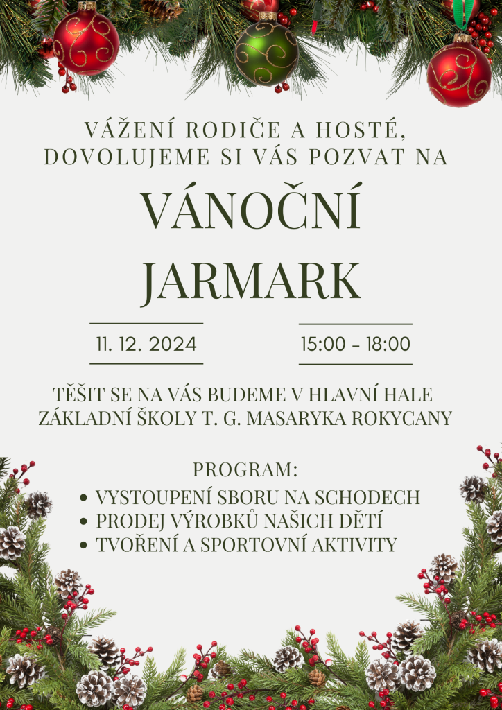 Vážení rodiče, rádi bychom Vás pozvali na Vánoční jarmark, který se uskuteční 11. prosince 2024 od 15.00. Přijďte se s námi podělit o vánoční atmosféru a strávit příjemné odpoledne.